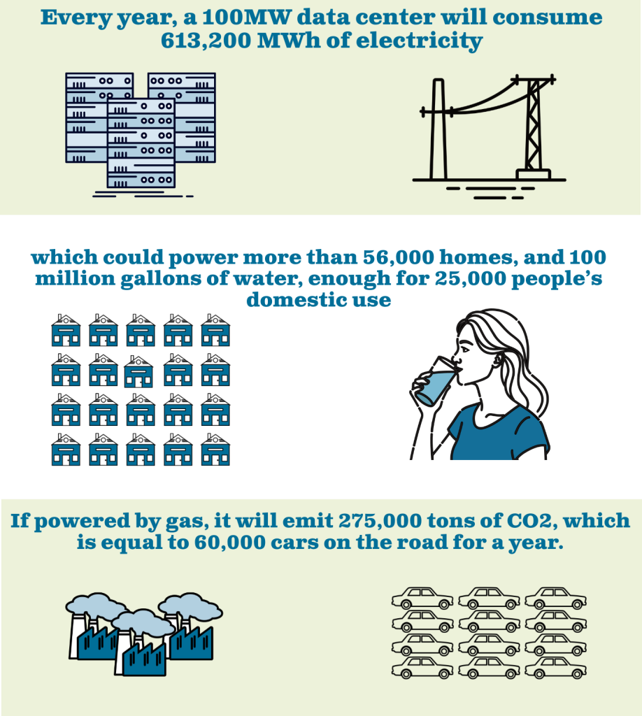 Data centers require an enormous amount of electricity and water to power and cool the processors, and range in size from a single room in an office building to massive “hyperscale” campuses. A typical size for a new data center is between 50 and 150 Megawatts (MW); AI-specialized “hyperscale” campuses can draw as much as 1 Gigawatt (GW) of electricity load.